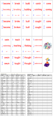 - 原形・〜ing形・意味のカードと過去形・過去分詞のカードがセットになるようになっています。
